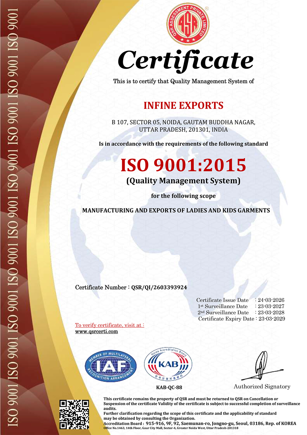 INFINE EXPORTS are vertically integrated garment factories established in the year 1990 by team comprising of self motivated and innovative leaders. Today our company is a trusted name in manufacturing and exporting of a wide range of fashion apparels and accessories for the US and European Markets.,